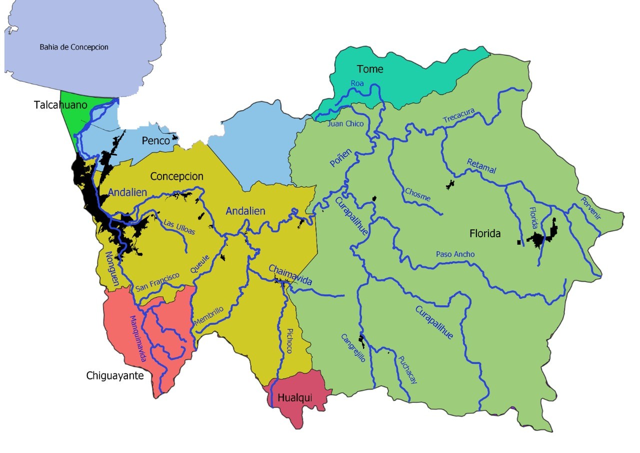 Figura 1, Cuenca del Río Andalien, principales tributarios, zonas habitada y division administrativa ; en azul los principales tributarios con sus nombres en azul; en negro las principales areas ocupadas con viviendas; y en areas coloreadas las distitnas comunas que cuentan con terreno en la cuenca del río Andalien.