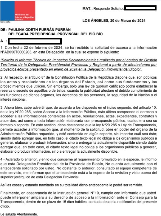 En febrero del mismo año, el Observatorio Latinoamericano de Conflictos Ambientales - OLCA solicitó vía transparencia a la Delegación Presidencial el informe sobre impactos de proyectos eólicos. Sin embargo, en su respuesta el organismo indicó que "no cuenta actualmente con el antecedente solicitado por usted. No obstante lo anterior, consultado el equipo competente de este servicio, me informan que el antecedente está a la espera de la revisión y visto bueno del superior jerárquico de esta Delegación Provincial", documento firmado por la delegada Paulina Purran Purran.