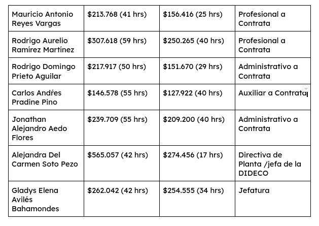 Entre los funcionarios municipales en cuestión, se encuentra la jefa de la Dirección de Desarollo Comunitario, Alejandra Soto, directiva de planta de la municipalidad que cobró 42 horas diurnas extra, recibiendo por ello $565.057 y además, otros 274.456 mil pesos por horas extra nocturnas.