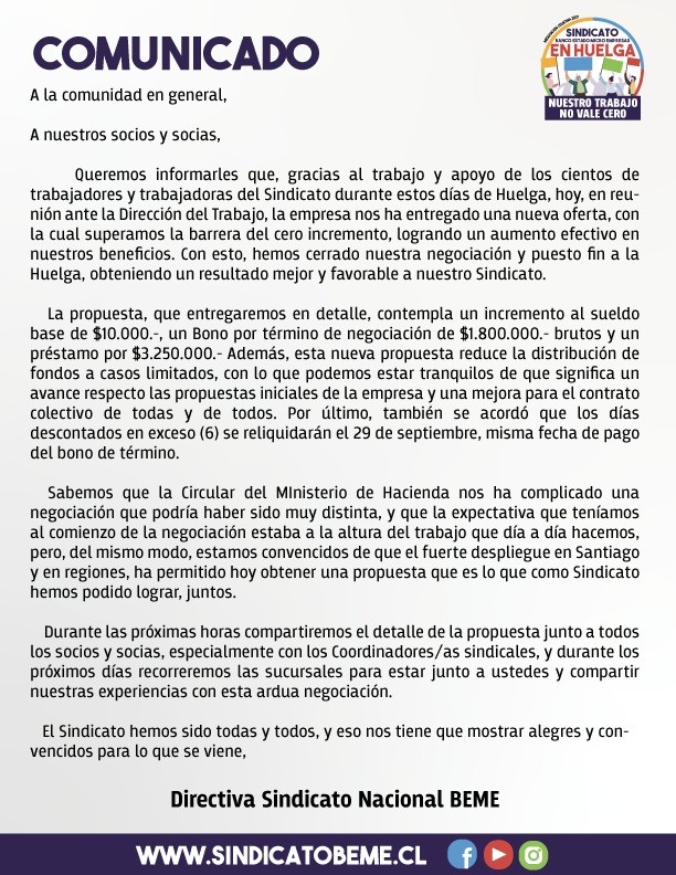 A continuación puedes revisar la carta de agradecimiento que envió BEME a quiénes les brindaron su apoyo, además de un comunicado en el que se especifican los resultados económicos que obtuvieron tras su primera huelga.