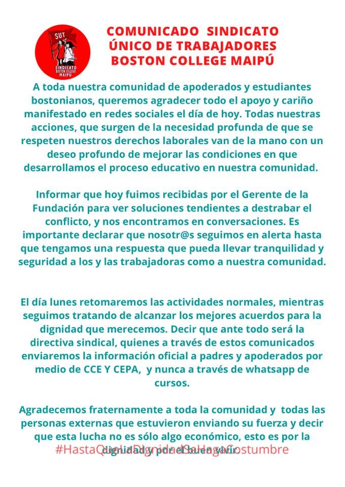 El pasado 01 de abril, el sindicato que compone a más de 140 trabajadores/asdel colegio Boston College Maipú, realizó un ‘‘apagón virtual’’ como manifestación en contra de su empleador, Fundación BostonEduca, debido a la vulneración de acuerdos legales en su contrato colectivo. Uno de ellos, es la negación del pago de internet para ejercer sus clases virtuales.Por Constanza Ulloa MillaguirDurante más de un año, trabajadores y trabajadoras del Boston College de Maipú se han visto afectadas durante las clases virtuales debido a que su empleador, Fundación BostonEduca, les negara otorgarles un aporte por internet. A su vez, el empleador quitó el bono de contrato colectivo de movilización y colación porque solo se entregaban durante las clases presenciales.El Boston College de Maipú durante este último tiempo se ha enfrentado a una crisis financiera desde que el colegio cambió de sostenedor. Por lo que, además de despedir a decenas de funcionarios/as en noviembre del año pasado, han tenido incumplimientos con el contrato colectivo de trabajo con sus trabajadoras/es, de manera que, se ha generado un conflicto educativo en el establecimiento.Dominique Fontalba, secretaria del Sindicato Único de Trabajadores (SUT) Boston College Maipú indicó aRESUMEN que el conflicto se arrastra desde el año pasado: ‘‘Se arrastra desde 2020, a raíz del trabajo online. cuando comenzamos la modalidad a distancia. Resulta que teníamos un bono de contrato colectivo que era de movilización y colación que, el empleador lo quitó porque interpretó la cláusula que ese beneficio se entregaba solo con clases presenciales, como estábamos online dejó de pagarlo’’.Revisa| A 24 días de huelga, Corporación Educacional El Bosque no se ha acercado a negociar con el Sindicato del emblemático Camilo Henríquez de TemucoDominique afirma que durante ese tiempo, el empleador no los tomó en cuenta. El sindicato lo planteó durante el Consejo Escolar y el Consejo de Profesores por lo que, con la suma de incumplimientos del contrato colectivo, el no pago de internet fue lo que rebasó el vaso: ‘‘Ya lo de internet superó con creces la paciencia y la tolerancia de todos, más encima estaban descontando movilización y colación. Aguantamos durante todo el año porque incluso hicimos una denuncia para pedir teletrabajo y nos salió en contra porque no correspondía para educación’’.Asimismo, Dominique aclara que la movilización nace no solo por los bonos, sino que también por el respeto de contratos, exigencias de derechos laborales y menor sobrecarga laboral: ‘‘Nuestra movilización no es únicamente por los bonos, sino que por mayor participación en las decisiones pedagógicas del colegio. Esto es un conflicto que tiene que ver netamente con lo educativo’’.Actualmente el sindicato se encuentra en conversaciones con el Gerente de la Fundación BostonEduca con la finalidad de mejorar sus condiciones laborales en el proceso educativo de su comunidad.Revisa el comunicado del sindicato a continuación: