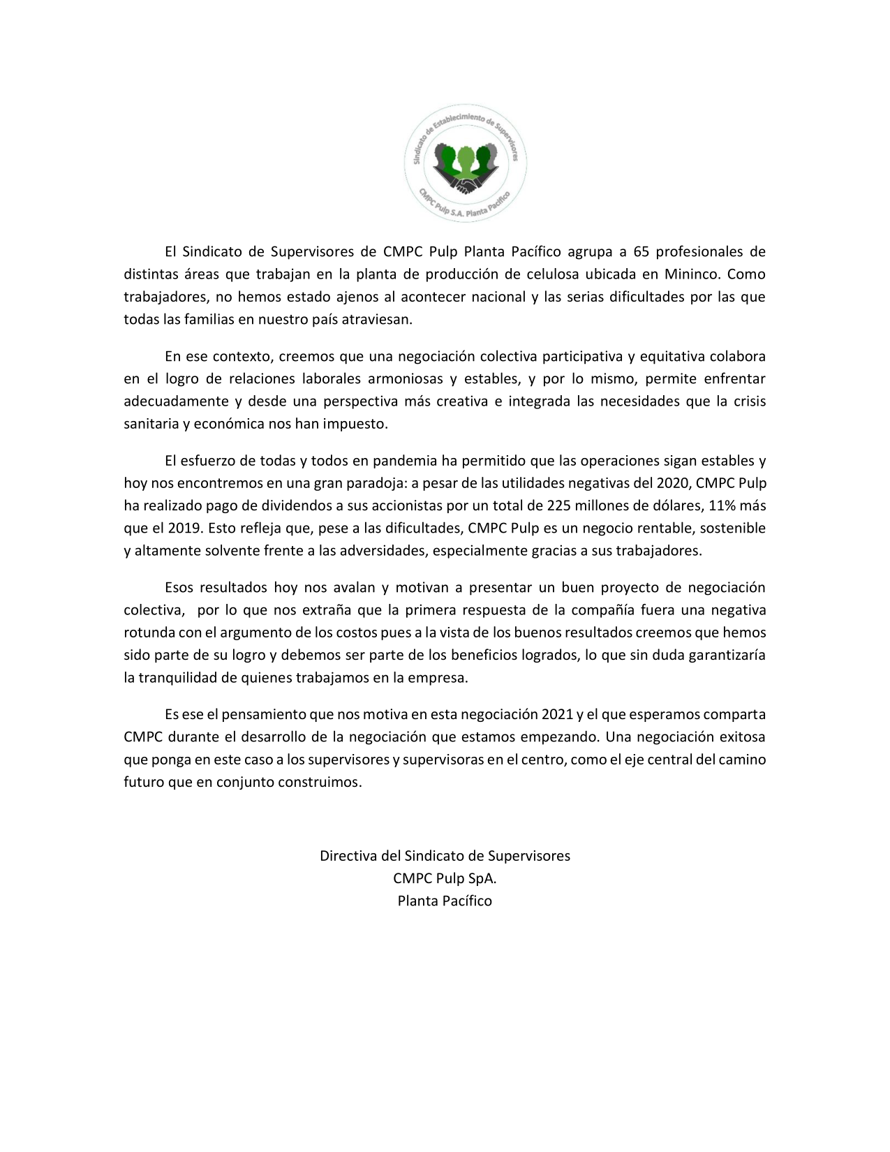 Asimismo, mediante un comunicado enviado por la Directiva del Sindicato de Supervisores de Planta Pacífico, las y los trabajadores indicaron que "CMPC Pulp ha realizado pago de dividendos a sus accionistas por un total de 225 millones de dólares", representando un 11% más que el año 2019.