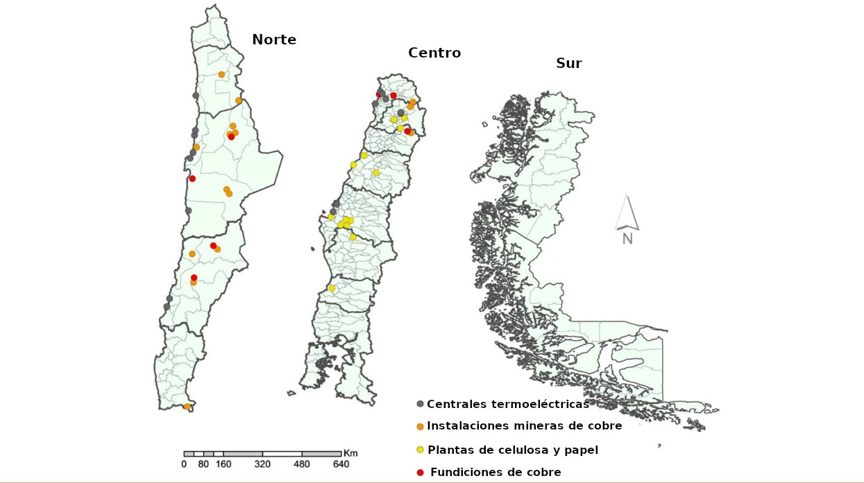 Mapa de Chile con ubicaciones de principales centrales termoeléctricas, instalaciones mineras de cobre, plantas de pulpa de celulosa y papel y funciones de cobre. Fuente: http://dx.doi.org/10.1016/j.envint.2016.03.036