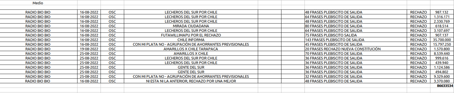 621 millones 564 mil 136 pesos ha gastado la campaña del Rechazo en publicidad en distintos medios locales y nacionales según la información disponible en la web del Servicio Electoral. El medio preferido del Rechazo es sin duda, Radio Bío Bío.