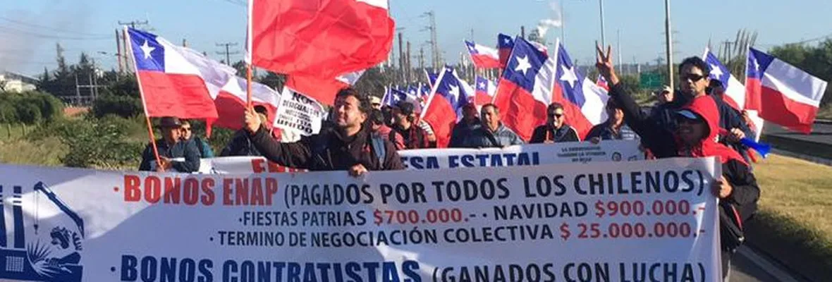 [resumen.cl] Alrededor de 400 trabajadores subcontratistas de ENAP se reunieron esta mañana en las afueras de la refinería estatal y marcharon por la costanera en Hualpén hasta Concepción. Protestaron contra los abusos a los trabajadores subcontratados y manifestaron su respaldo al movimiento popular chileno.