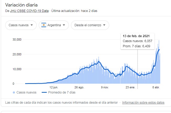 Incluso Argentina transita también por un alza importante de contagios y sus servicios sanitarios comienzan a saturarse a una gran velocidad, la curva de casos nuevos muestra un alza impresionante en las últimas dos semanas.