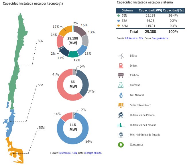 De acuerdo al más reciente informe de abril de este año, emitido por la Comisión Nacional de Energía "El total nacional de capacidad instalada al mes está categorizada en un 43,5% de termoelectricidad, 22,7% hidroelectricidad y un 33,8% de Energías renovables no convencionales" (Ver figura)