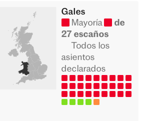 El partido Conservador es barrido en Gales, no obtuvo ningún representante, de las 32 circunscripciones 27 de ellas fueron para el Partido Laborista, 4 para los independentistas galeces del Plaid Cymru y uno para el Partido Liberal Demócrata.