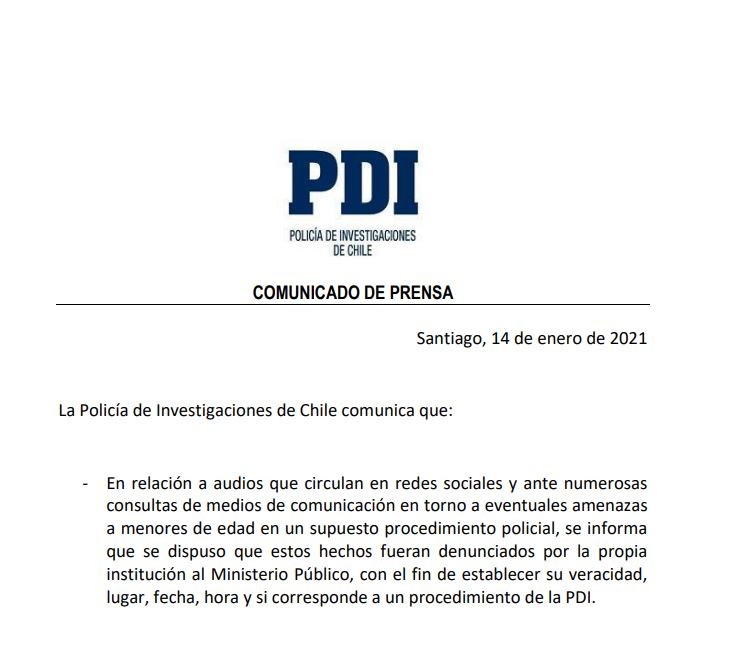 Tras su difusión, se hizo público un comunicado donde la propia policía plantea que "se dispuso que estos hechos fueran denunciados por la propia institución al Ministerio Público, con el fin de establecer su veracidad, lugar, fecha y hora y si corresponde a un procedimiento de la PDI".