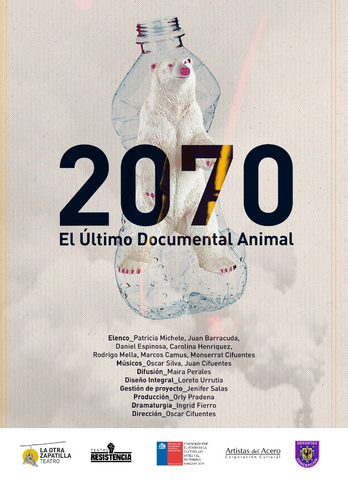“Quizás, esto sea sólo una obra, quizás para algunos sea sólo una bonita representación de lo que “está sucediendo” y “podría suceder en 50 años”, pero para mí, no. Esto es una semilla en potencia que germina gracias a la convicción del trabajo colaborativo de muchas y muchos; para toda la comunidad. Para esto, hicimos una coalición entre las compañías Teatro Resistencia y La otra zapatilla, lo que es un hito significativo, que no sólo implica confianza y credibilidad mutua, sino también un compromiso político por lo que se quiere poner en escena. Eso me tiene muy contenta, ya que conozco y admiro el trabajo de mis colegas, quienes tienen una larga trayectoria, destacando su perseverancia, y entrega en el teatro, y por otro lado, Resistencia, es una compañía joven, creativa, muy activa con la que trabajamos arduamente desde el activismo ya sea en escuelas, poblaciones, organizaciones de mujeres, y centros culturales.Espero que esta obra, puedan verla todos los niños y niñas de la región del Biobío y de Chile, en especial los que no tienen “acceso” a pagar por una entrada. Es por esto, que el proyecto contempla funciones gratis a todo público, en las que se realizará una mediación post-función que culmina con la entrega del libro “2070, el último documental animal”, ilustrado y publicado especialmente como una herramienta pedagógica para los niños y niñas agentes críticos en formación, la gran esperanza de nuestra sociedad”. Ingrid Fierro. Dramaturga de 2070, El último documental animal.