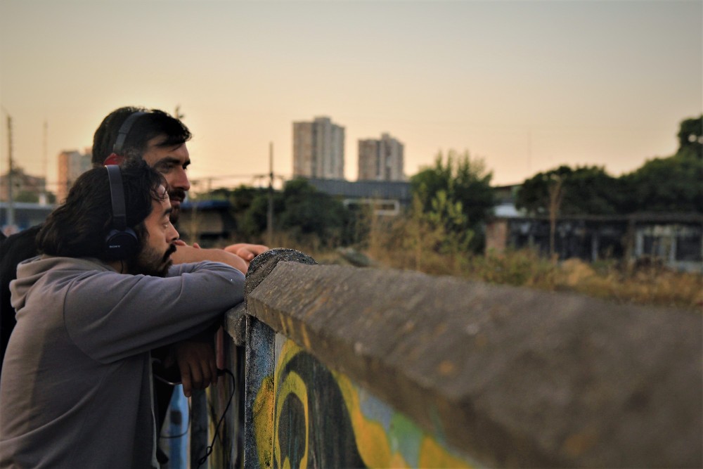 El director José Miguel Neira junto al productor general Victor Vargas en las ruinas de Cristalería Schiavi. Fotografía de Luciano Pérez.