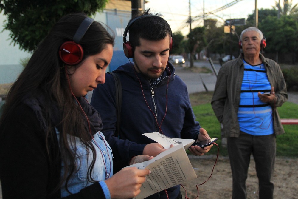 Paralelamente a este trabajo está la implementación de los aspectos técnicos para poder realizar el recorrido de la obra, y poder activar los audios durante este. Para ello se construyó una aplicación georeferenciada través de la cual activar los audios. Junto con esto, hubo mucho tiempo del proceso en donde trabajamos en las posibilidades lumínicas y sonoras para “teatralizar” los espacios cotidianos, como una forma de extrañar la mirada del espectador y poder accionar o intervenir la ciudad a partir de ese lugar. Ello nos llevó, por ejemplo, a probar con proyecciones en el espacio público, de las cuales gran parte de estas búsquedas se sintetizaron en la intervención en la antigua Fundición Imperial.