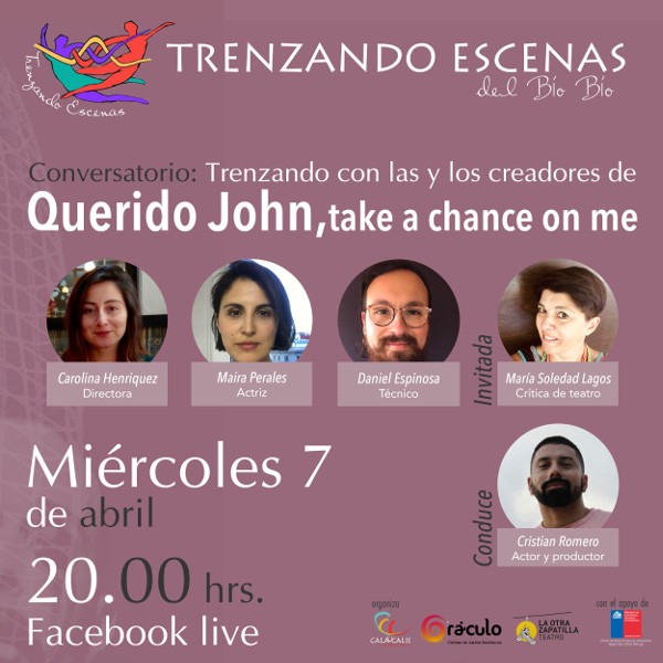 El proyecto Trenzando Escenas del Bio Bio es financiado por el Fondo de Artes Escénicas Itinerantes regionales 2020 del MINCAP y este miércoles 7 de Abril, a las 20:00 horas, presentará un nuevo capítulo del programa “Trenzando Escenas con las y los creadores”, esta vez dedicado a profundizar en el proceso creativo de Querido John, Take a chance on me. El espacio será conducido por el actor y productor Cristian Romero, mediado por la investigadora y crítica de teatro María Soledad Lagos, con la participación de Carolina Henríquez directora, Daniel Espinosa técnico y Maira Perales actriz, integrantes de la Compañía La Otra Zapatilla. Este capítulo, así como los anteriores, se podrá ver y participar a través del Facebook live de Calaucalis y Teatro Oráculo.