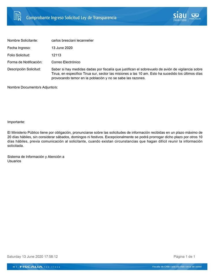 Cuando ocurrieron los primeros avistamientos, Resumen contactó al equipo de comunicaciones de la Municipalidad de Tirúa a propósito del vuelo de aviones en la zona, sin embargo, desde la municipalidad afirmaron que nadie les ha entregado ninguna información respecto al sobrevuelo de aeronaves militares.