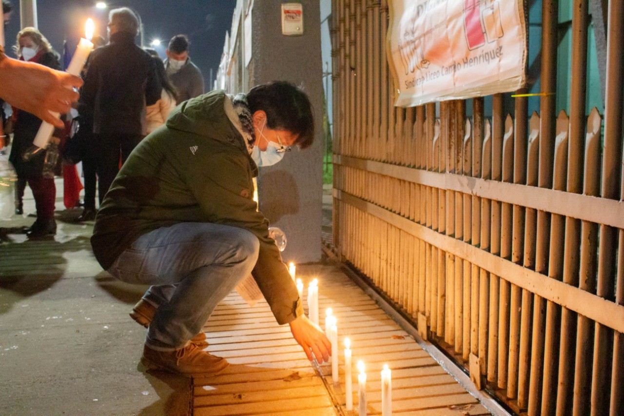 [resumen.cl] Por "respeto, justicia y dignidad" en su día N° 73 de huelga el Sindicato de Trabajadoras y Trabajadores del Liceo Camilo Henríquez de Temuco realizó, en conjunto con apoderadas/os y estudiantes, una velatón para visibilizar el conflicto sostenido por la falta de voluntad de diálogo por parte de Corporación Educacional El Bosque.