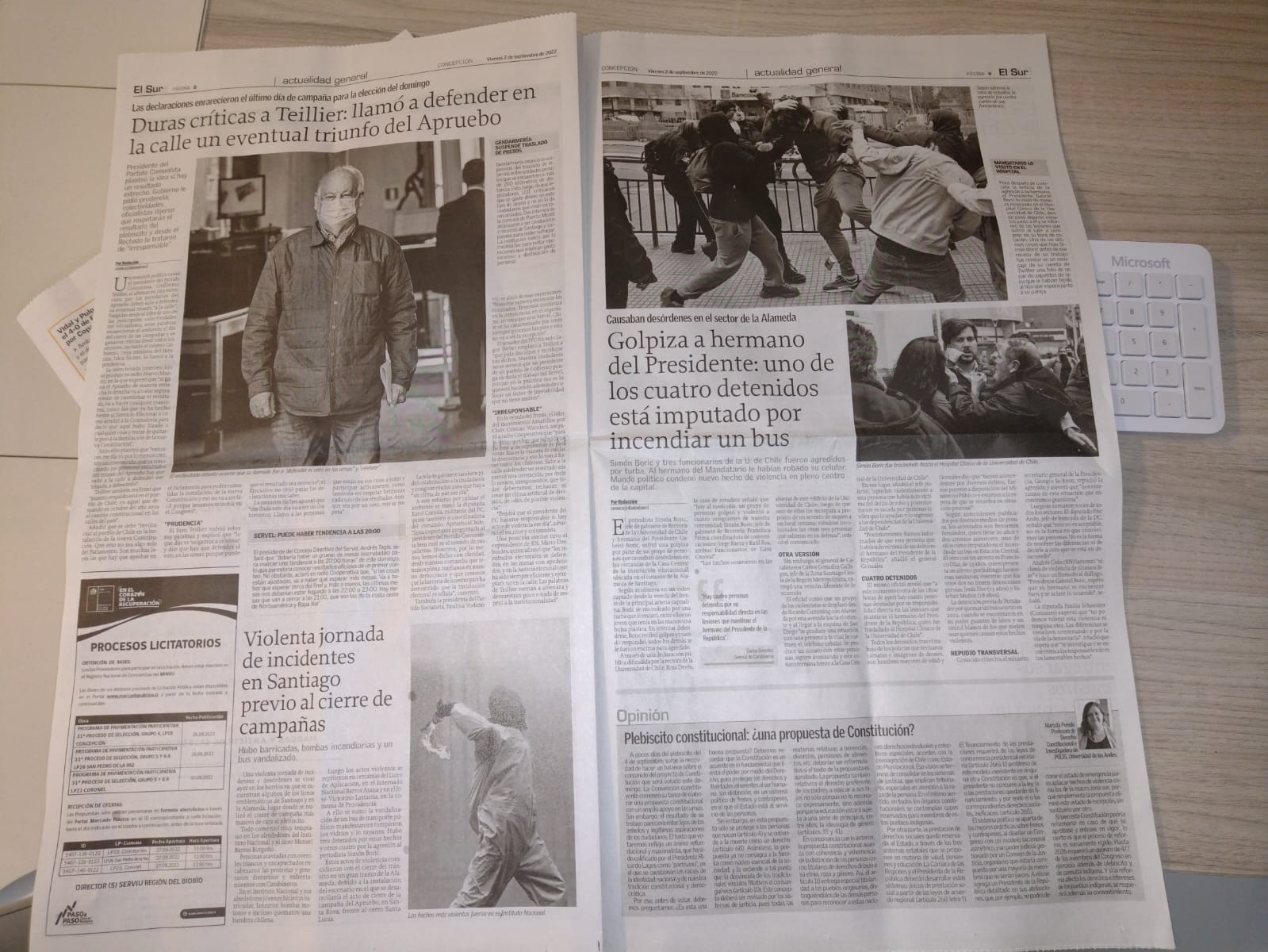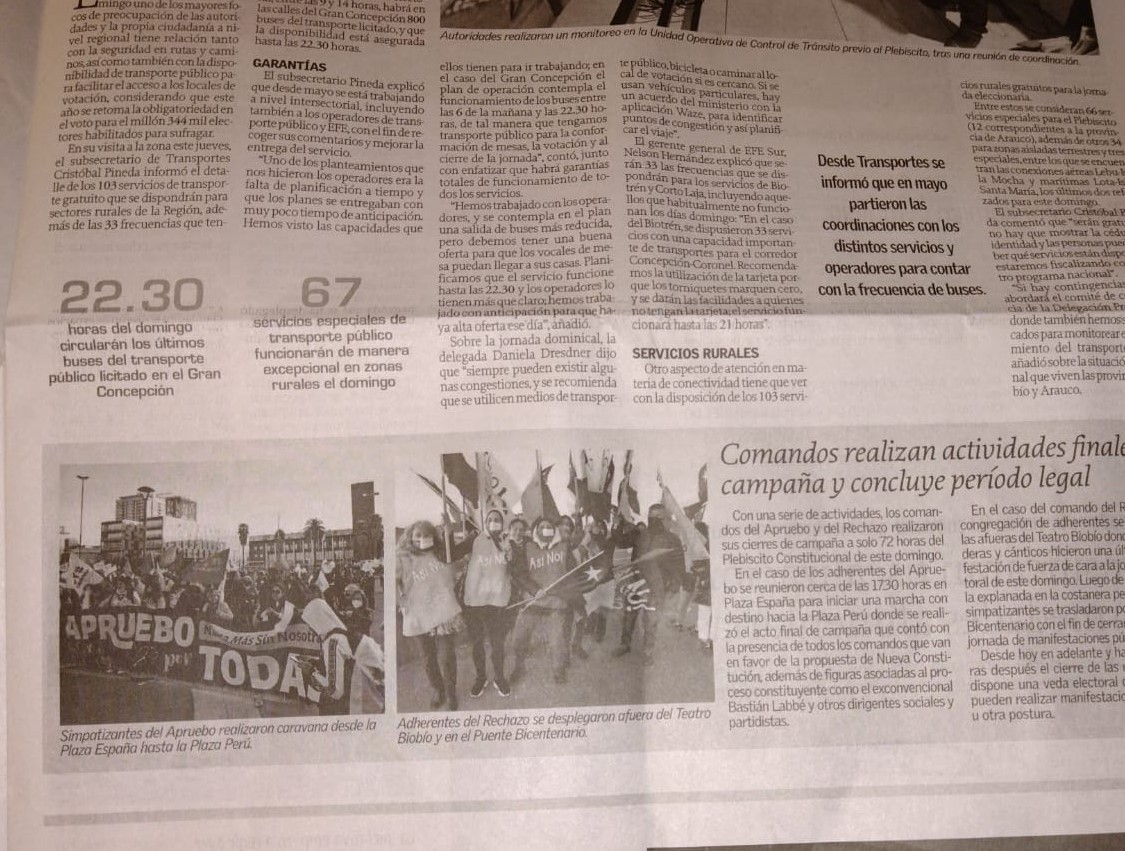Algo similar ocurrió en Concepción, con la cobertura de diario El Sur, que realizó el mismo intento de igualar las convocatorias, con fotos de planos cerrados. Además, otorgó dos páginas destacando los incidentes en el término de la campaña en Santiago y los dichos de Tellier (PC) sobre defender un eventual triunfo del Apruebo en las calles, junto a una columna poniendo en tela de duda el proceso constitucional.