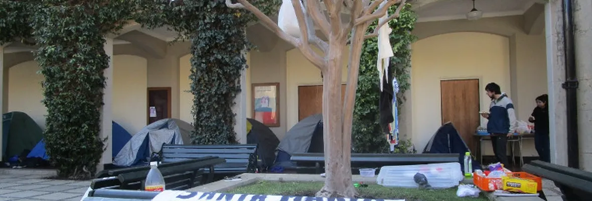 Desde hace un par de semanas un grupo de aproximadamente 30 alumnos de la Sede de Concepción de la Universidad Santa María han realizado una verdadera “toma” del patio central de la USM en Valparaíso, instalando un campamento con el objetivo de apoyar y presionar a la mesa negociadora que llevan adelante, exigiendo un petitorio que entre sus puntos centrales reclama por transparencia en las decisiones académicas y administrativas tomadas a nivel central recientemente en la sede sureña, como asimismo buscado implementar un funcionamiento democrático en la toma de decisiones universitarias, con participación activa de los estudiantes, académicos, y del personal administrativo y auxiliar.