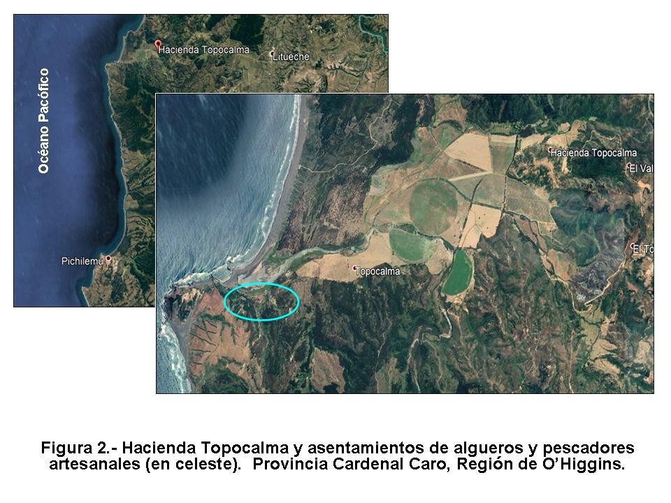 Hoy, en Topocalma, la ocupación ancestral de su zona costera hecha por algueros-pescadores, entra nuevamente en pugna, pero ahora contra los intereses del empresario Jorge Gálmez, dueño de Sociedad Topocalma S.A, que adquirió la Hacienda Topocalma en el año 2007, un gran “predio rústico” que tiene como deslinde por el “weste”, todo el borde costero de la comuna de Litueche y una parte del de la comuna de Navidad. Acá pretende desarrollar distintos proyectos inmobiliarios de lujo, cuyo slogan de venta viene con la idea incorporada de “playas privadas” y exclusivas, una impopular frase para nuestro imaginario colectivo, en el que las playas figuran aún como bienes cuyo dominio y goce pertenece a todos los habitantes del territorio nacional.