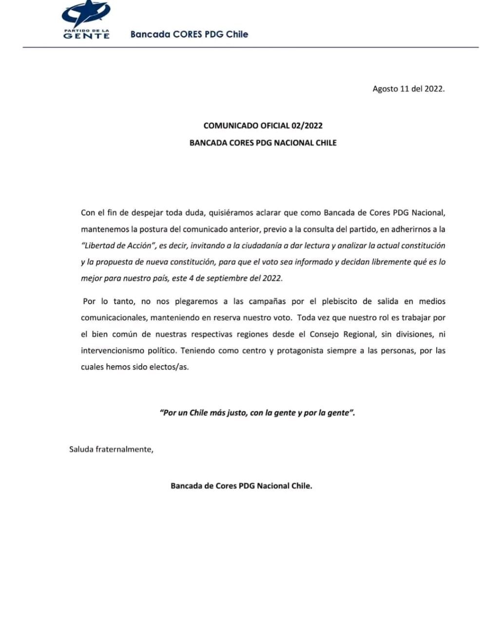 Un comunicado emitido el pasado 11 de agosto de la bancada nacional de Cores del PDG señala que "adherimos a la 'Libertad de Acción'" añadiendo que invitan a la población a "dar lectura y analizar la actual constitución y propuesta de nueva constitución, para que el voto sea informado y decidan libremente qué es lo mejor para nuestro país, este 4 de septiembre de 2022".