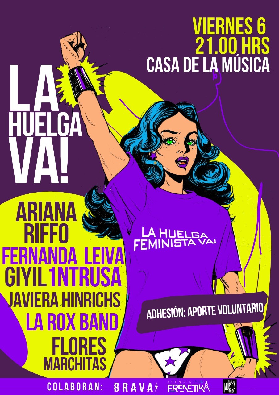“La huelga va!” contará con la participación de los proyectos musicales de Ariana Riffo (Pop), Javiera Hinrichs (Folk), Fernanda Leiva (Pop), Giyil (Soft Dark Pop), 1ntrusa (trap-rap), La Rox Band (Rock Blues), y Flores Marchitas (Punk). El concierto está dirigido a toda la comunidad, pero especialmente a las jóvenes que se interesen por conocer nuevos referentes femeninos en la música. La entrada es con aporte voluntario y se realizará en Casa de la Música (Aníbal Pinto 1661, Concepción), a partir de las 21:00 horas. Más información en las redes sociales de las organizaciones articuladas al concierto y en el evento: