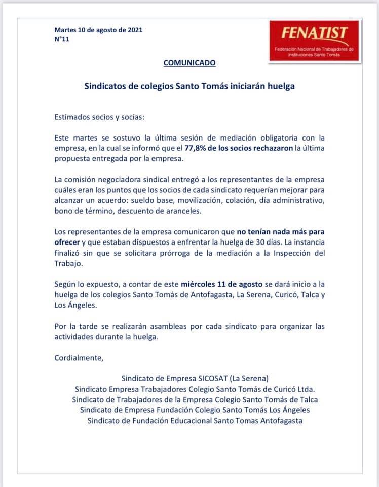 El pasado 11 de agosto inició una huelga en cinco Colegios Santo Tomás distribuidos a lo largo del país tras fallidas negociaciones entre la empresa administradora y sus respectivos sindicatos. Las peticiones son simples y se remiten a asegurar un trabajo digno para todos los estamentos que conforman las instituciones estudiantiles.