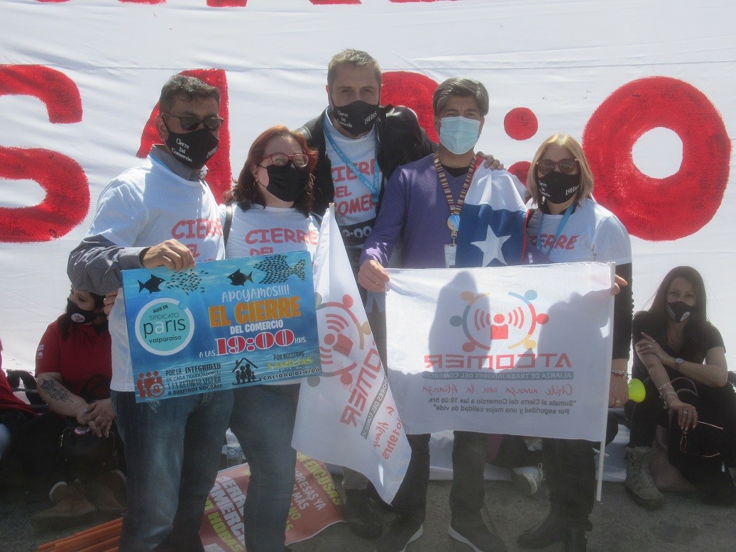 “Lucía Pantoja, alianza Atcomer (Alianza de Trabajadores del Comercio) y estamos luchando acá para el cierre del comercio a las 19 horas; Fenacenco (Federación Nacional Alianza Cencosud), cierre del comercio a las 19 horas".