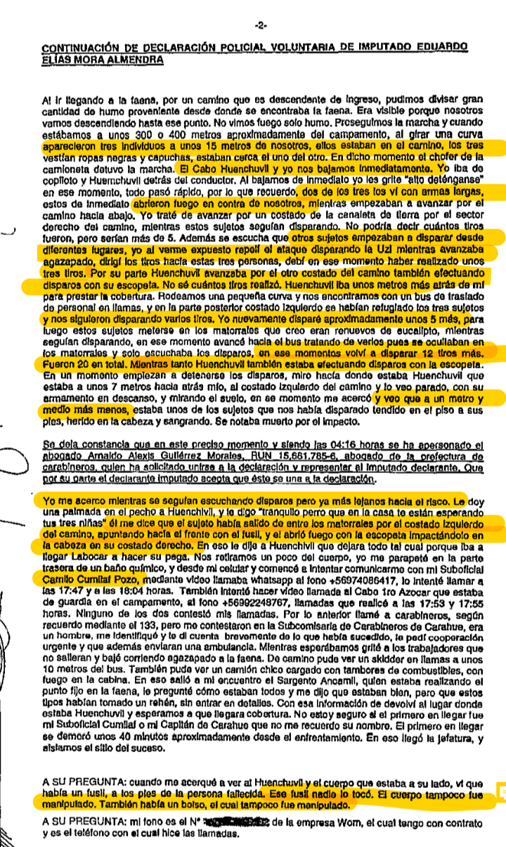 Declaración de uno de los Carabineros implicados en el asesinato de Pablo Marchant. Imagen extraída de @LaOtradiaria FUENTE: https://laotradiaria.cl/2021/11/17/tres-disparos-en-el-bosque-ultimo-informe-forense-revela-que-pablo-marchant-habria-sido-ejecutado/