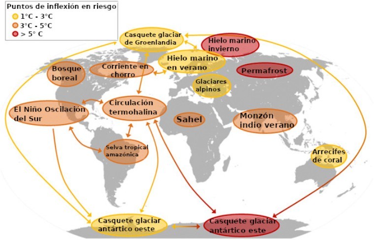 Mapa global de potenciales puntos de inflexión y efecto "cascada". Los elementos de inflexión individuales están coloreados de acuerdos a su límite estimado en un promedio de temperaturas globales (puntos de inflexión). Las flechas muestran las potenciales interacciones entre los elementos de inflexión basadas en la estimulación que podría generar efectos cascada. Nótese que aunque el riesgo crítico de pérdida del casquete polar en la Antártica oriental es propuesto a más de 5°C, algunos sectores marinos en la Antártica oriental pueden ser vulnerables a más bajas temperaturas. Fuente: https://doi.org/10.1073/pnas.1810141115