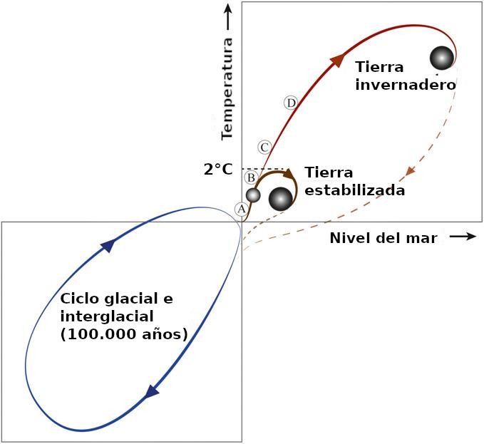 Ilustración esquemática de las posibles tendencias futuras en el clima, en contexto de los ciclos glaciales e interglaciales típicos (abajo a la izquierda). Los niveles del mar siguen al cambio de las temperaturas de una forma relativamente lenta debido a la expansión termal y la fundición de los glaciares y las capas de hielo. La línea horizontal en medio de la figura representan los niveles de temperatura preindustriales, y la actual posición del Sistema Tierra es mostrada por una pequeña esfera en la línea roja cercana a la divergencia entre los caminos "Tierra Estabilizada" y "Tierra Invernadero". La frontera planetaria propuesta de ∼2 °C por sobre los niveles preindustriales también es mostrada. Las letras sobre los caminos de "Tierra Estabilizada" y "Tierra Invernadero" representan los cuatro periodos del pasado reciente de la Tierra que pueden dar una idea de las posiciones a lo largo de estos caminos. (A = medio Holoceno); B = Eemian o también llamado periodo Interglaciar Riss-Würm); (C = Plioceno Medio) y D (Mioceno Medio). Fuente: https://doi.org/10.1073/pnas.1810141115
