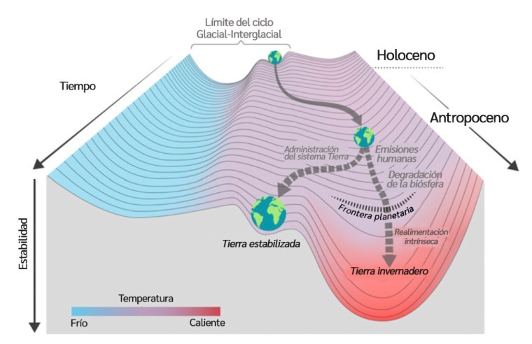 Paisaje de estabilidad que muestra las tendencias futuras del Sistema Tierra fuera del Holoceno y por lo tanto, fuera del ciclo glacial-interglacial y su posición presente en Antropoceno más caliente. La bifurcación en el camino del Sistema Tierra es mostrada aquí como 2 diferentes vías (flechas punteadas). Actualmente el Sistema Tierra está en el camino hacia una "Tierra Invernadero" debido a las emisiones antropogénicas de gases invernadero y la degradación de la biosfera a través de la frontera planetaria de ∼2 °C más allá de la cual el sistema seguirá un esencialmente irreversible camino derivado por sus realimentaciones biogeofísicas intrínsecas. El otro camino lleva a una "Tierra Estabilizada", una vía de administración del sistema climático terrestre, guiada por realimentaciones antropogénicas para generar un cuasi estable estado apto para la mantención de las sociedades humanas.