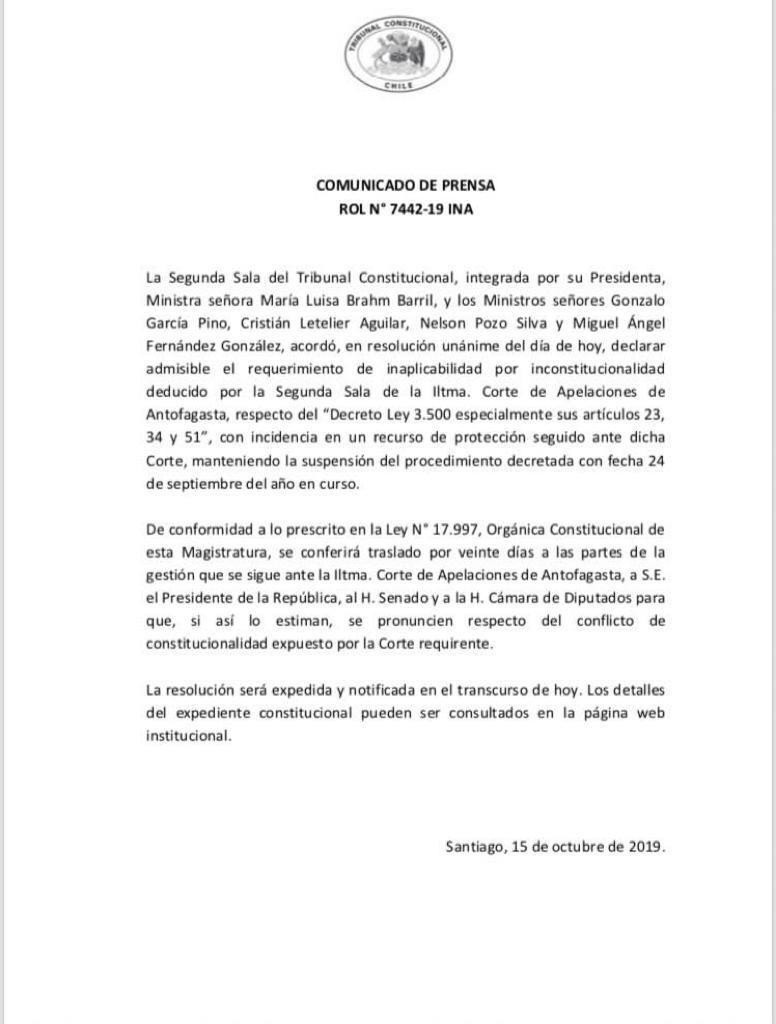 En su comunicado el TC señala que "acorde en resolución unánime del día de hoy, declarar admisible el requerimiento de inaplicabilidad por inconstitucionalidad deducido por la Segunda Sala de la Iltma. Corte de Apelaciones de Antofagasta".