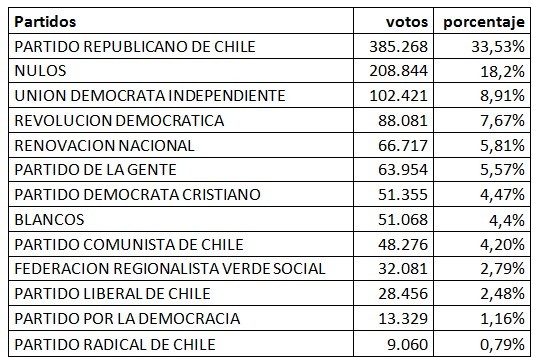 A nivel regional Partido Republicano es el más votado con 385.268 sufragios, 33,53% del total de votos, en segundo lugar la opción más marcada fue el Nulo con 208.844 sufragios, representando un 18,2% del total. El resto de los partidos ninguno llega al 10% de los sufragios.