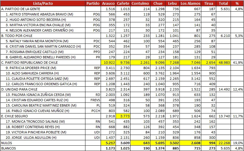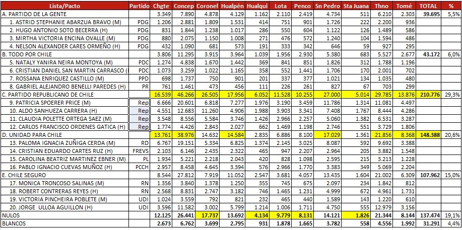En las Provincias de Arauco es donde Republicanos alcanza su mejor promedio: 41,9% de los votos; en la Provincia de Bio Bio alcanza un 39,9%; y en la provincia de Concepción un 29,3%.