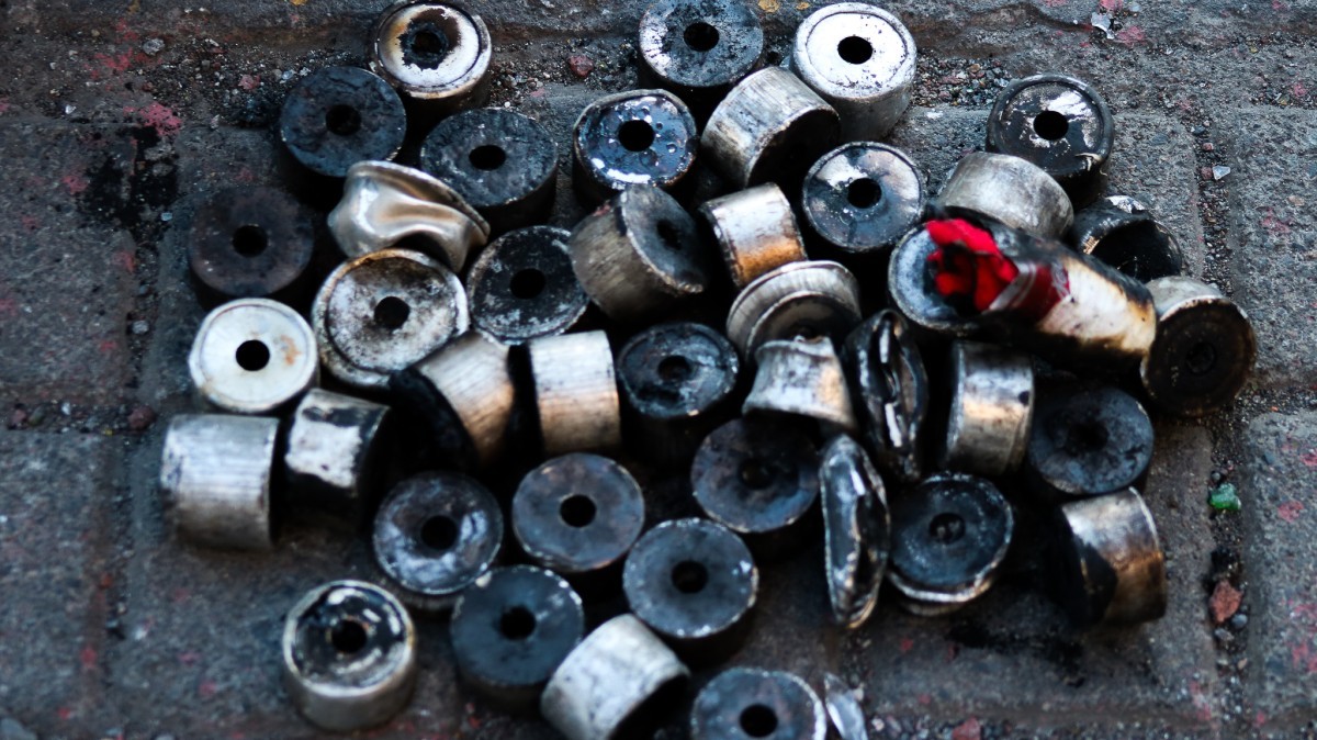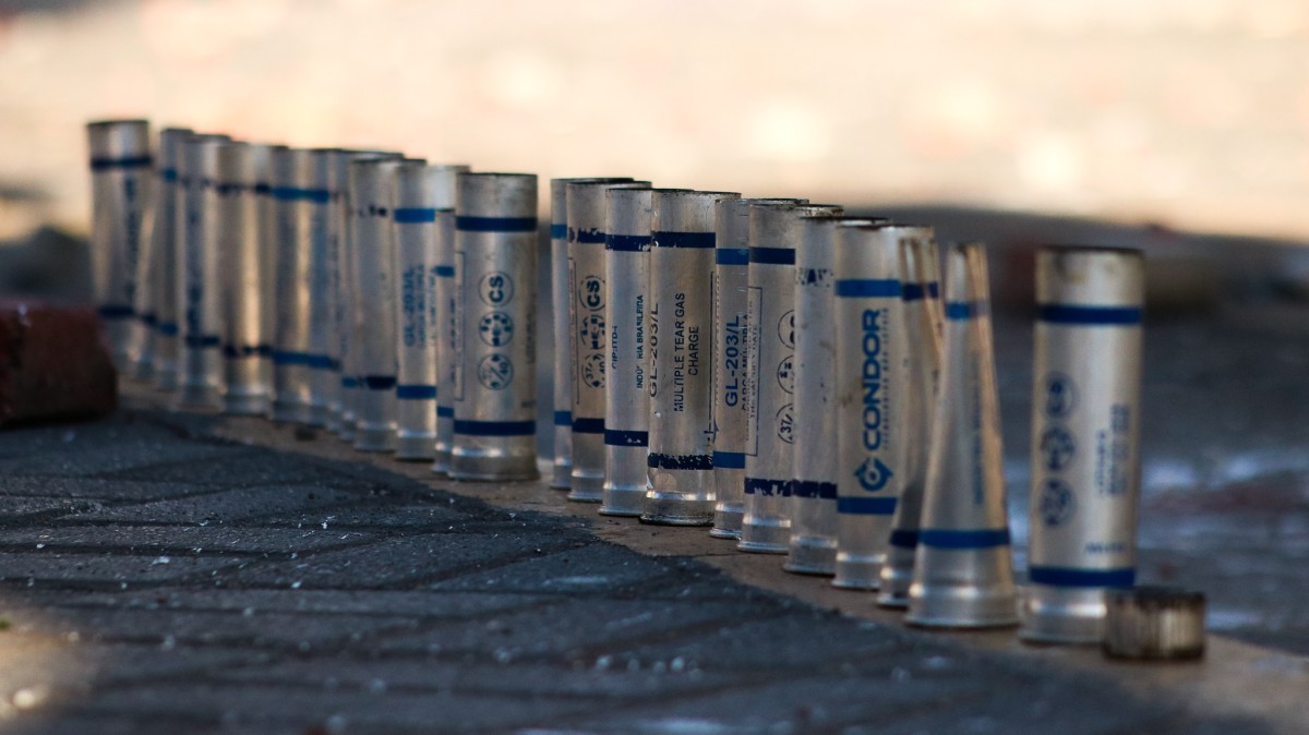 Restos de cartuchos de lacrimógenas acumulados por manifestantes a modo de denuncia de su uso intensivo en Concepción. Foto: Indómita Fotografía