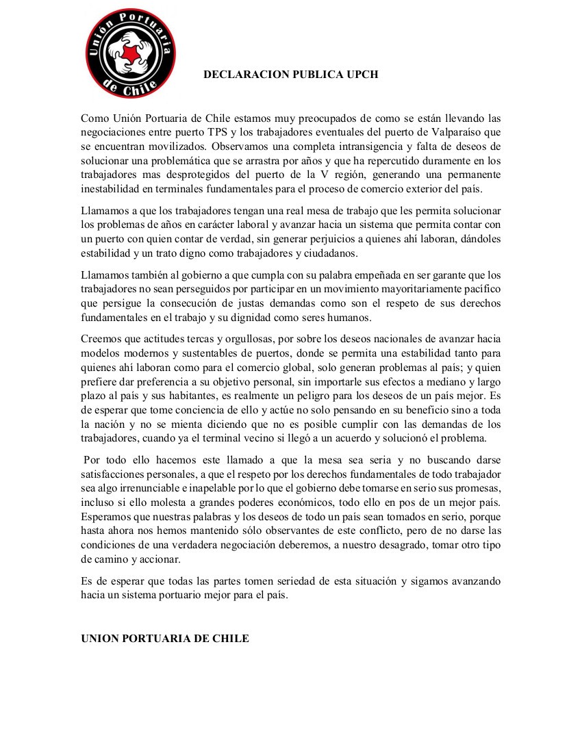 A través de una declaración pública, la Unión Portuaria de Chile ha emplazado al gobierno a que intervenga de manera seria en un conflicto que hoy cumple 2 semanas y que incluye bloqueos al terminal portuario. Cabe recordar que durante la jornada de ayer, los portuarios de Valparaíso denunciaron un intento de secuestro de uno de sus dirigentes por parte de 3 desconocidos, que en sus amenazas al portuario aludían a que finalizara la movilización.