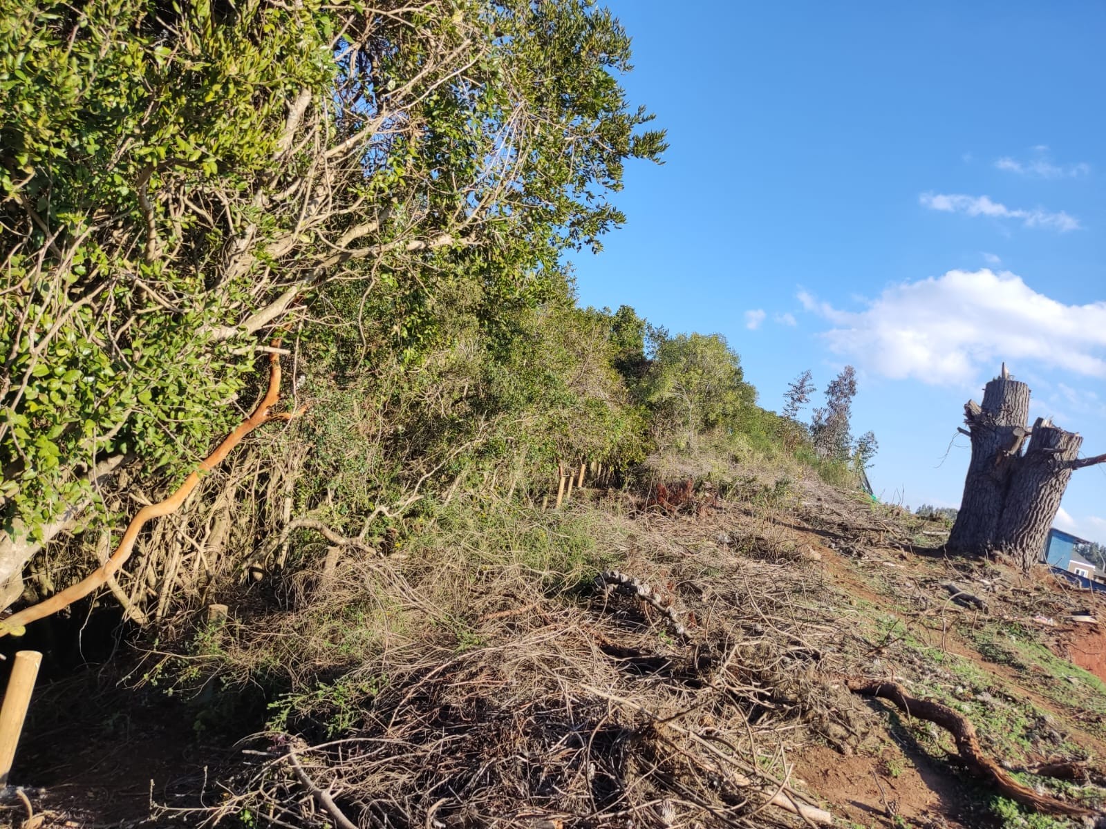 En la ribera del río Andalién en Concepción, el avance del negocio inmobiliario ha ido reduciendo cada vez más los espacios naturales de uso comunitario. En el sector ubicado frente a Cosmito, justo en el recodo del río, vecinos y vecinas del lugar han denunciado una nueva intervención en la vegetación nativa. Esta vez se trata de polines con cemento en el borde de la ladera que alberga uno de los últimos relictos de bosque nativo del sector.