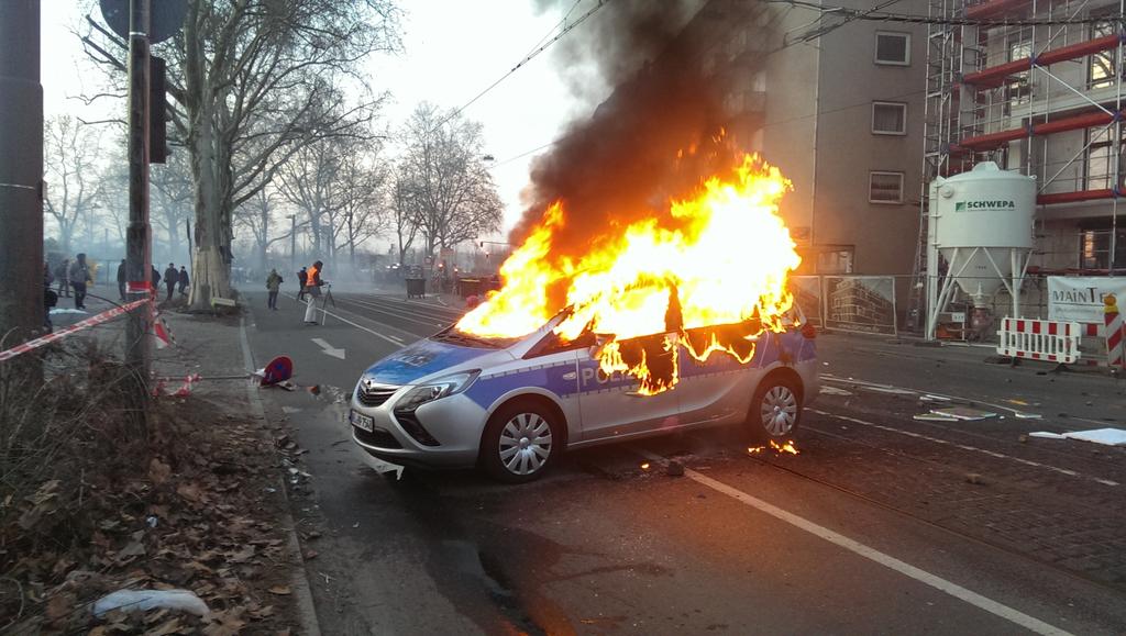 En la manifestación, en coincidencia con la inauguración oficial de la nueva y espectacular sede de la entidad europea, Blokupy espera unos 10.000 asistentes. Pero los actos represivos han comenzado esta madrugada. Varios cientos de manifestantes, a los que la policía, que tiene tomado el barrio financiero de Francfort, reprimía cuando intentaban acercarse al edificio del BCE, han comenzado a incendiar coches y arrojar bombas caseras contra las fachadas de varios edificios bancarios y diversos elementos de mobiliario urbano.