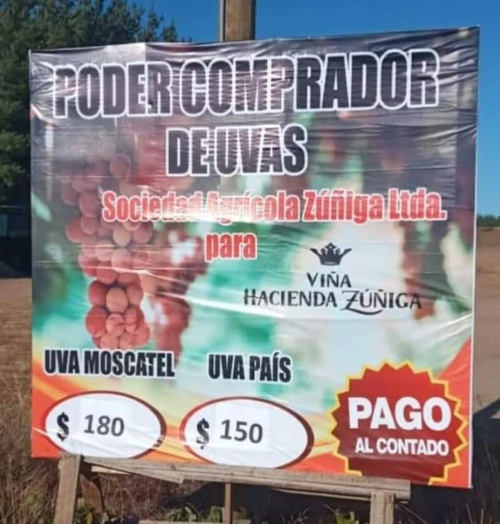 [caption id="attachment_128833" align="aligncenter" width="720"] Anuncio de Sociedad Agrícola Zúñiga y Zúñiga Limitada de precios de compra por kilo de uva Moscatel y País. Vendimia 2022.[/caption]