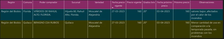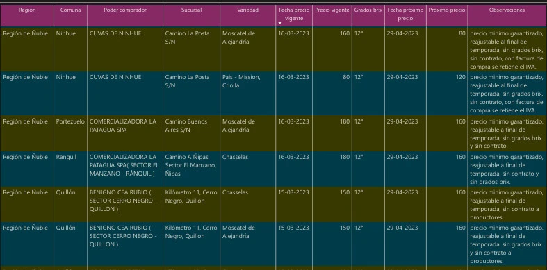 De acuerdo a la información proporcionada por la Oficina de Estudios y Políticas Agrarias (Odepa), los precios para el kilo de Moscatel de Alejandría bordean los $160, mientras que la uva País se está comprando a $80 el kilo. Estas dos variedades son las más producidas en el valle del Itata, por cuanto sus valores determinan buena parte de los que las y los productores obtendrán por el cultivo de sus vides. Por otra parte, las cepas francesas como Cinsault y Cabernet Sauvignon, se están comprando a precios que bordean los $100 y los $130 por kilo, respectivamente, lo cual resulta catastrófico para quienes accedieron al plan del Instituto de Desarrollo Agropecuario (Indap) de sustituir las vides españolas por estas, con la promesa de ser pagadas a un mayor valor.
