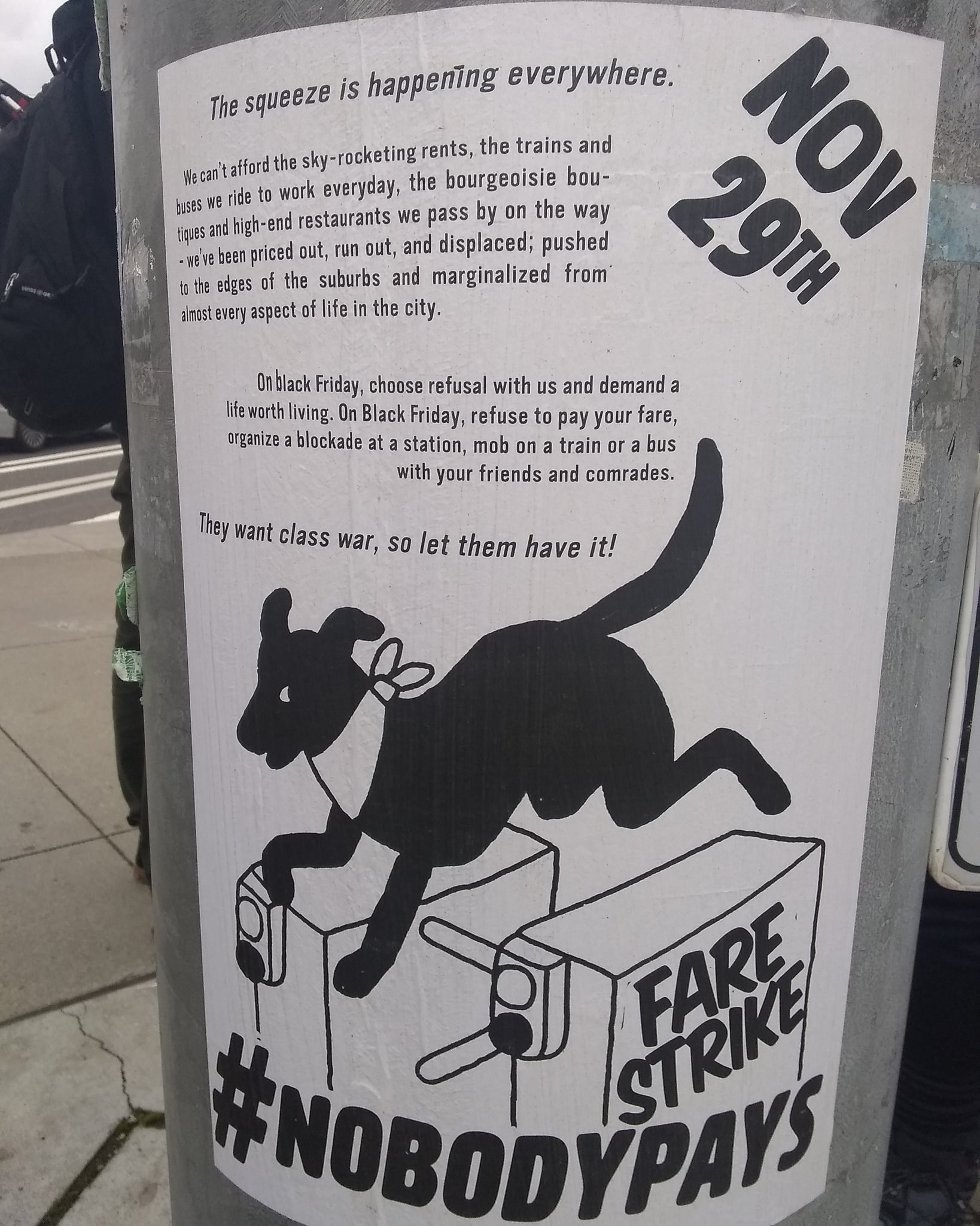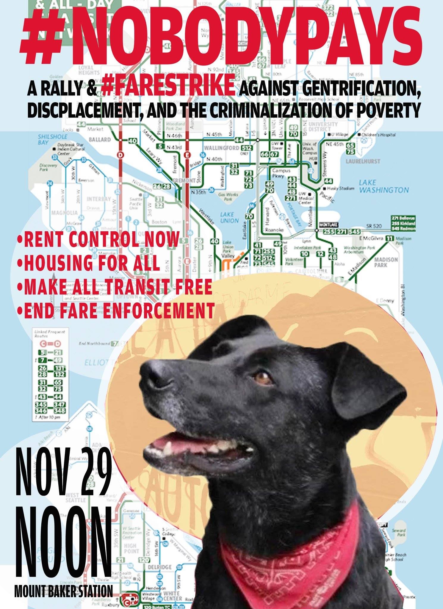 Convocatoria a evadir metro en Seattle, EEUU, con la imagen del negro matapacos