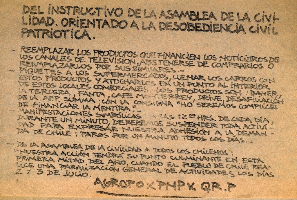Instructivo para la realización de la Jornada de Protesta del 2 y 3 de julio, 1986 | Fuente: memoriachilena