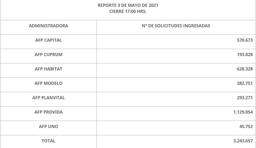 En términos de cifras, AFP Provida es la Administradora con mayor cantidad de solicitudes ingresadas, siendo a las 17:00 horas del 3 de mayo 1.129.054, seguida de AFP Habitat con 628.328 y AFP Capital con 570.673.