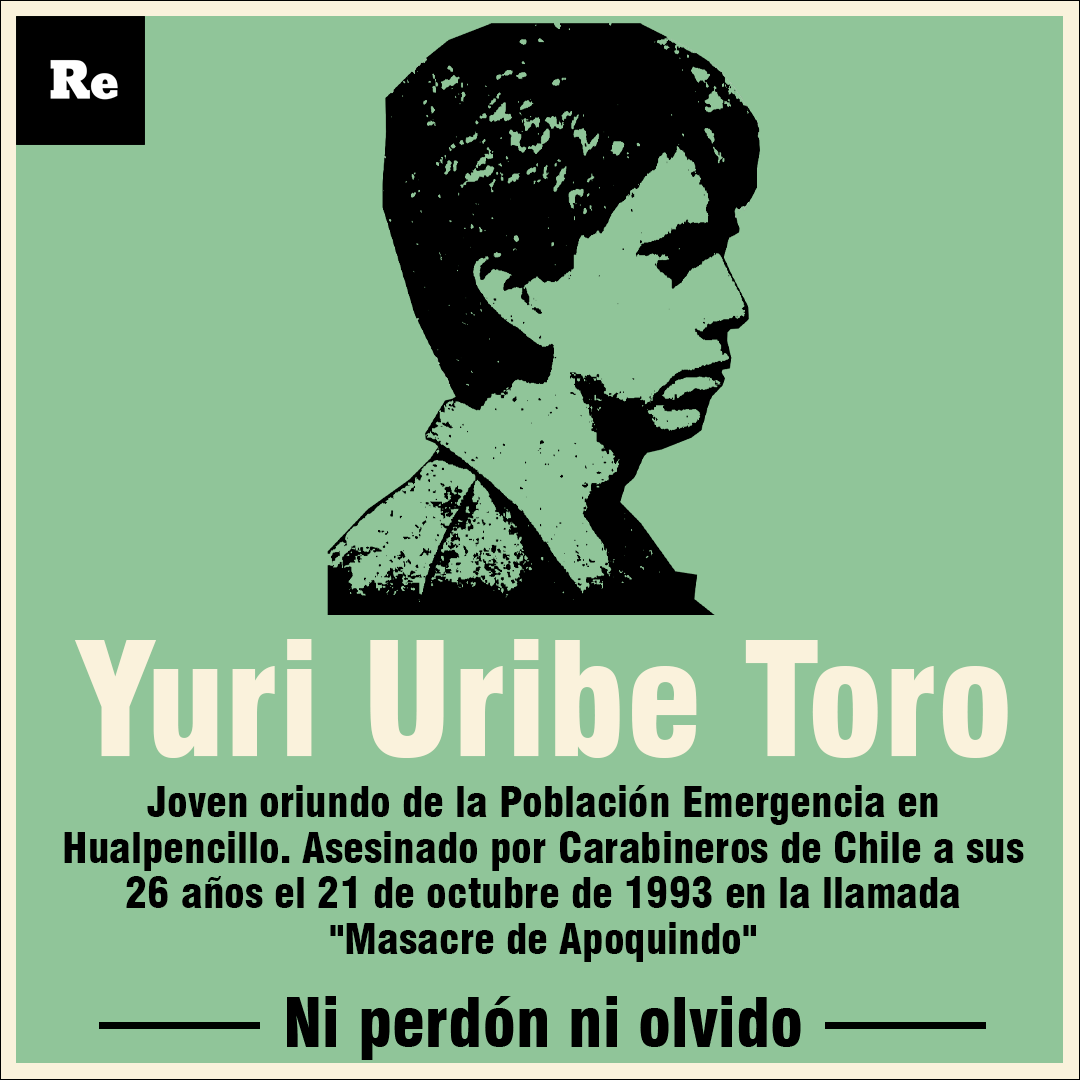 [resumen.cl] A sus 26 años el joven oriundo de Hualpencillo fue asesinado en la llamada "Masacre de Apoquindo" por efectivos de Carabineros. Como una persona determinada, amable, analítica y con capacidad de sobreponerse a las situaciones adversas es recordado Yuri Uribe Toro por compañeras/os del Movimiento Juvenil Lautaro y su familia.